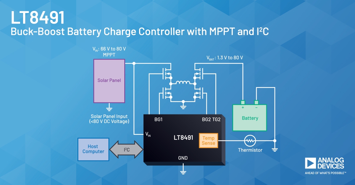 L’américain propose un circuit de contrôle de charge de batterie abaisseur-élévateur à interface I²C gérant jusqu’à 80V et calculant le point MPPT.