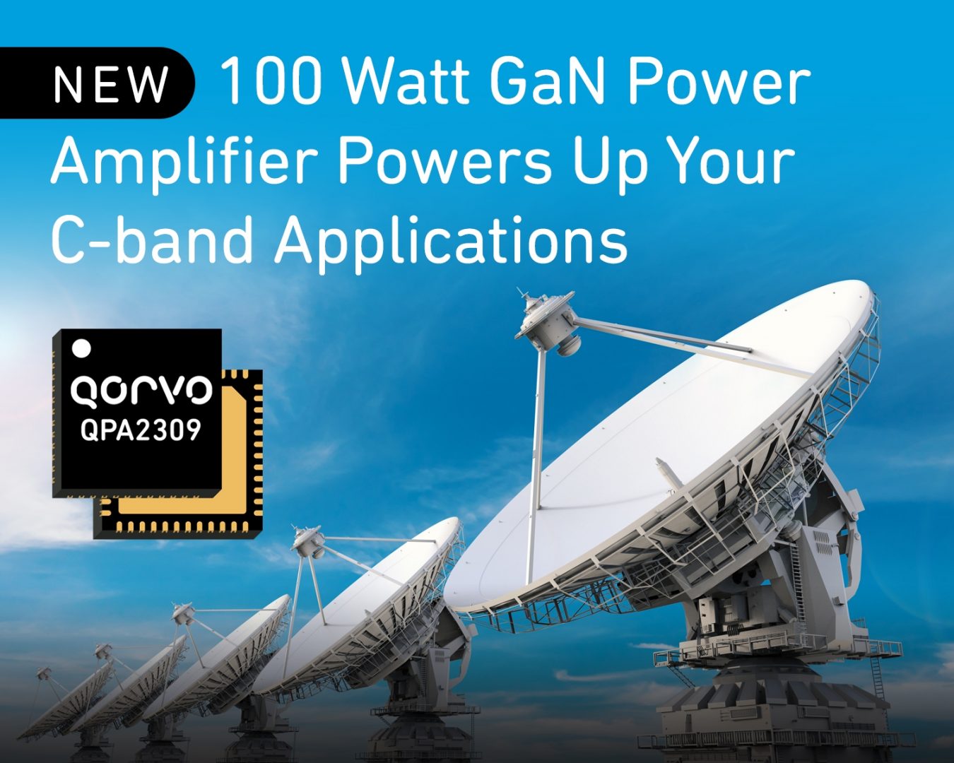 Le plus puissant amplificateur de puissance RF GaN en boîtier QFN de 7x7mm : c’est ainsi que Qorvo décrit le QPA2309, son dernier amplificateur en bande C (5-6GHz) pour radars et applications militaires et aéronautiques. Ce circuit délivre jusqu’à 100W avec un rendement de puissance ajoutée de 52%, et ne nécessite pour cela aucun composant RF externe. L’américain propose également, dans le même boîtier, le modèle QPA2310 limité, lui, à 50W. Ces circuits sont actuellement en cours d’échantillonnage.