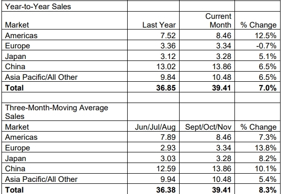 Au niveau géographique, les ventes ont en effet augmenté d’année en année dans les Amériques de 12,5%, ainsi qu’en Chine (+6,5%), en Asie-Pacifique hors Chine (+6,5% également) et au Japon (+5,1%), mais ont légèrement diminué en Europe (- 0,7%). D’un mois sur l’autre, les ventes ont augmenté au Japon (+5,2%), en Europe (+3,6%), dans les Amériques (+2,1%) et en Chine (+0,1%), mais ont diminué en Asie-Pacifique hors Chine (-0,5%).