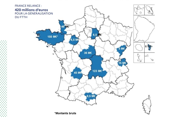 Le plan de relance consacre 570 M€ pour l’accélération de la généralisation de la fibre optique sur le territoire national dont 420 M€ sont alloués dès à présent. L’utilisation des 150 M€ restants sera précisée à l’été.