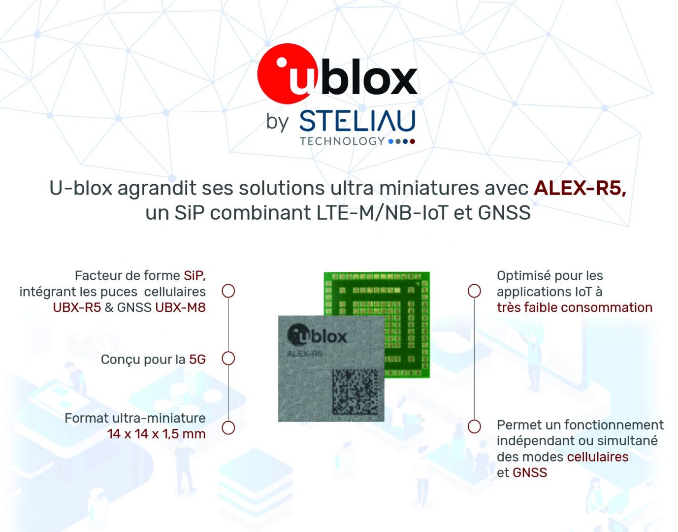ALEX-R5, nouveau module ultra miniature 14 x 14 mm, avec 100% de technologies u-blox inside (cellulaire et GNSS) offre à la fois une connectivité LTE-M / NB-IoT et un positionnement GNSS en simultané.
