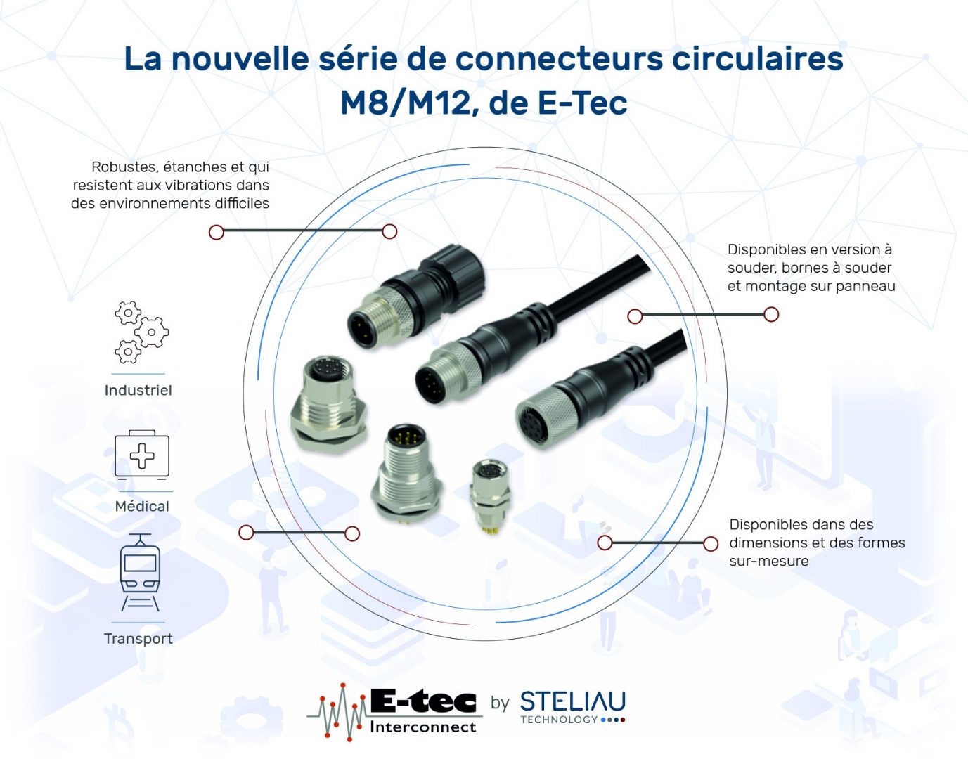 Les connecteurs circulaires M12 et M8* du fabricant E-tec – représenté en France par Steliau Technology – constituent une solution fiable et robuste pouvant répondre aux applications les plus exigeantes. lls ont l’avantage de s’adapter facilement à de nombreux supports et interfaces permettant la transmission de signaux et de puissance.