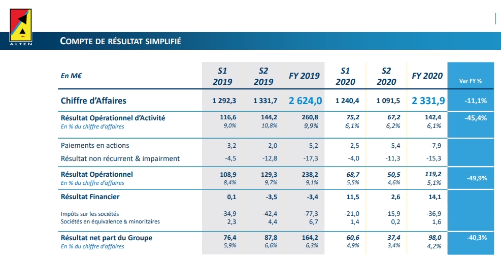 La société d’ingénierie française Alten a présenté un chiffre d’affaires 2020 en baisse de 11,1%, avec 2332 millions d’euros. Le chiffre d’affaires national a lui affiché 907,5 millions d’euros, contre 1134,5 millions d’euros en 2019, représentant 38,9% du chiffre du groupe au lieu de 43,2% en 2019. Le résultat opérationnel du groupe a lui plongé de 49,9%, passant de 238,2 millions d’euros en 2019 à 119,2 millions d’euros en 2020. La crise sanitaire a fortement impacté les pays exposés à l’automobile et à l’aéronautique avec une contribution au chiffre d’affaires du groupe passant de 34% en 2019 à 25% début 2021. A l’inverse, les secteurs du ferroviaire, naval, sciences de la vie et énergie (sauf le pétrole et le gaz) sont toujours en croissance.