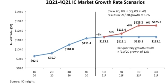 La société d’analyse IC Insights a réhaussé ses prévisions concernant les ventes mondiales de semi-conducteurs en 2021. Tablant initialement sur une croissance de 12%, IC Insights envisage désormais une progression de 19% induite par des hausses séquentielles de 2% au premier trimestre (une première depuis dix ans), 3% au deuxième, 8% au troisième et 0% au dernier. Ce scénario à 19% est même jugé prudent par IC Insights. Il serait le résultat d’une forte hausse des volumes de vente (+17%), les prix unitaires n’augmentant eux que de 1%.