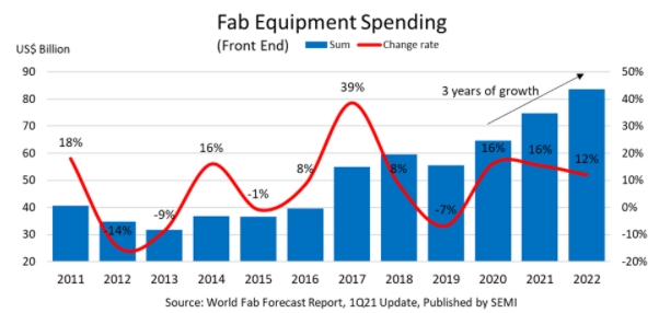 Selon le rapport World Fab Forecast de Semi, les dépenses en équipements de fabrication dans l’industrie mondiale des semi-conducteurs vont encore augmenter, alimentées par la pandémie. L’organisation industrielle prévoit trois années consécutives de records entre 2020 et 2022, la hausse la plus sensible, 16%, concernant l’année 2020.