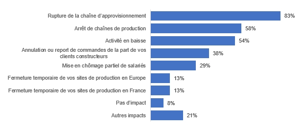 Les conséquences des pénuries, citées par les répondants, se manifestent par une rupture de la chaîne d’approvisionnement (83%), un arrêt des chaines de production (58%), une baisse de l’activité (54%), une annulation ou un report de commandes des clients constructeurs (38%), une mise en activité partielle de salariés (29%), une fermeture temporaire de sites de production en Europe (13%), une fermeture temporaire de sites de production en France (13%).