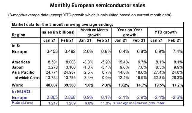 Sur les deux premiers mois de l’année, les ventes de semi-conducteurs ont diminué de 2,6% en euros, mais ont progressé de 7,4% en dollars. Par rapport à la même période de 2020, elles ont progressé de 6,8% en dollars.