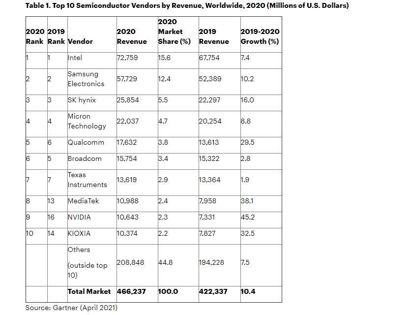 Intel a conservé sa position de premier fournisseur mondial de semi-conducteurs en termes de chiffre d’affaires en 2020, suivi de Samsung Electronics, SK Hynix et Micron (voir illustration). Le chiffre d’affaires d’Intel en semi-conducteurs a augmenté de 7,4%, grâce à la croissance de ses activités principales de processeurs pour ordinateurs grand public et pour serveurs. Dans l’ensemble, les plus performants du top 10 en 2020 en termes de croissance étaient Nvidia et MediaTek. La croissance de 45,2% enregistrée par Nvidia a été principalement tirée par les activités liées au jeu vidéo et aux centres de données de la société. Les revenus de MediaTek ont, quant à eux, augmenté de 38,1% en 2020.