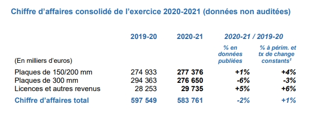 Au total, le chiffre d’affaires de l’ensemble de l’exercice 2020-2021 a atteint 583,8 millions d’euros, en hausse de 0,9% à périmètre et taux de change constants par rapport à l’exercice 2019-2020. Soitec confirme son ambition d’atteindre plus de 900 millions d’euros pour le chiffre d’affaires de l’exercice 2021-2022.