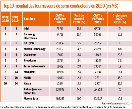 STMICROELECTRONICS ET NXP NE FIGURENT PLUS DANS LE TOP 10 DU CLASSEMENT ÉTABLI PAR GARTNER, CÉDANT LEURS PLACES À NVIDIA ET MEDIATEK, QUI ONT AFFICHÉ UNE FORTE CROISSANCE EN 2020.