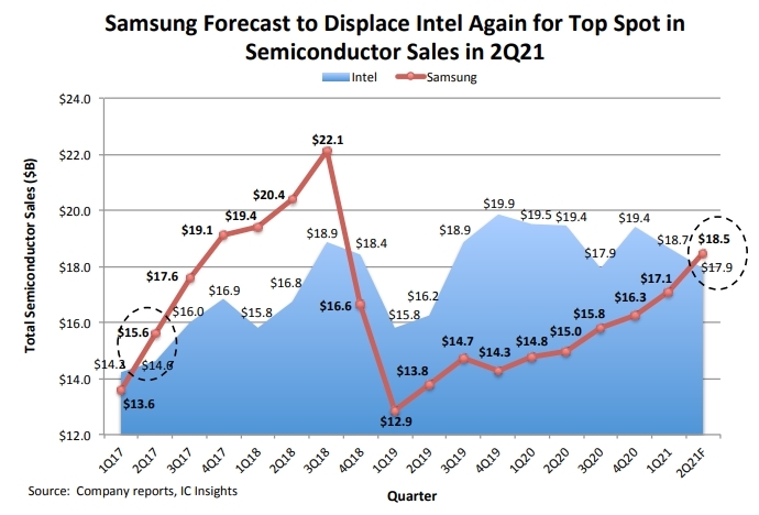 Les revenus d’Intel ont fortement rebondi au second semestre 2019, mais sont restés stables pendant la majeure partie de 2020. Sur une période de 10 trimestres (du 4e trimestre 2018 au 1er trimestre 2021), Intel est resté le fournisseur numéro 1. Poussé par un marché des mémoires en plein essor et des ventes relativement stables pour Intel, IC Insights estime que Samsung remplacera à nouveau Intel en tant que premier producteur de semi-conducteurs à partir du 2e trimestre 2021.