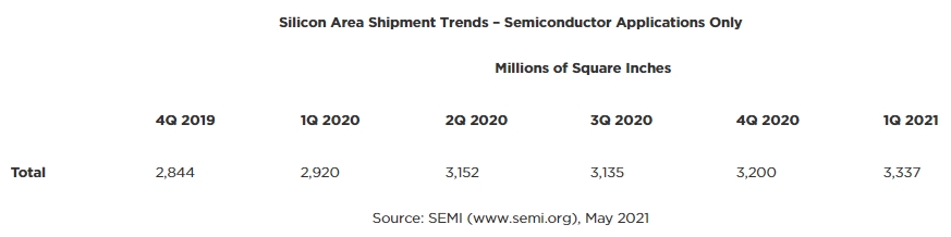 Le SMG (Silicon Manufacturers Group), un sous-comité de l’organisation industrielle Semi, a rapporté un nouveau record d’expéditions de tranches de silicium avec 3337 millions de pouces carrés au 1er trimestre 2021. Le précédent record datait du 3e trimestre 2018.