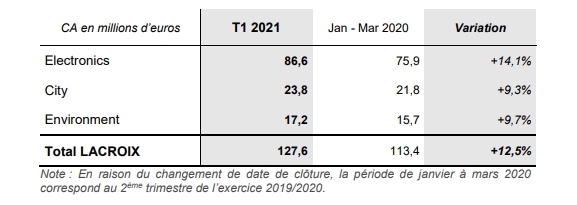 Le sous-traitant électronique et spécialiste de l’Internet des objets industriels Lacroix a affiché un chiffre d’affaires de 127,6 millions d’euros pour le 1er trimestre, soit une hausse de 12,5% par rapport au 1er trimestre 2020. Par secteurs, l’activité Electronics présente un chiffre d’affaires en progression de 14,1% à 86,6M€, se rapprochant des niveaux du 1er trimestre 2019. En croissance de 9,3% par rapport à la même période en 2019/2020, l’activité City enregistre un chiffre d’affaires de 23,8M€, ce qui représente une hausse de 5,7% par rapport au 1er trimestre 2019, grâce aux divisions éclairage public et V2X (Vehicle-To-Everything ou communication du « véhicule à tout »). L’activité Environment est également en augmentation de 9,7% avec 17,2M€, au lieu de 15,7M€ entre janvier et mars 2020, grâce aux marchés de l’eau et aux réseaux électriques intelligents (smart grids).