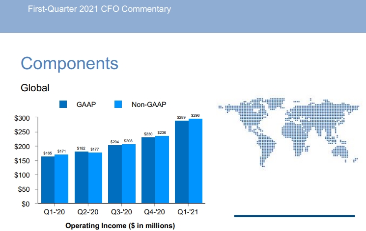 Les mêmes conditions ont révélé des ventes de composants en Europe en hausse de 19,7% (+10,1% si non conformes aux PCGR), soit 1,569 Md$ au lieu de respectivement 1,309Md$ et 1,425 Md$. Ces ventes sont tirées par les secteurs de la défense, du transport, de l’éclairage et de l’aéronautique. A l’échelle mondiale, les ventes de composants ont explosé de près de 42%, avec 6,4Md$ contre 4,5Md$, toujours dans les mêmes conditions. Mais ce n’est rien comparé aux +88% relevés pour les ventes de composants en Asie-Pacifique : 3,2Md$ au lieu de 1,7Md$ pour le 1er trimestre 2020.