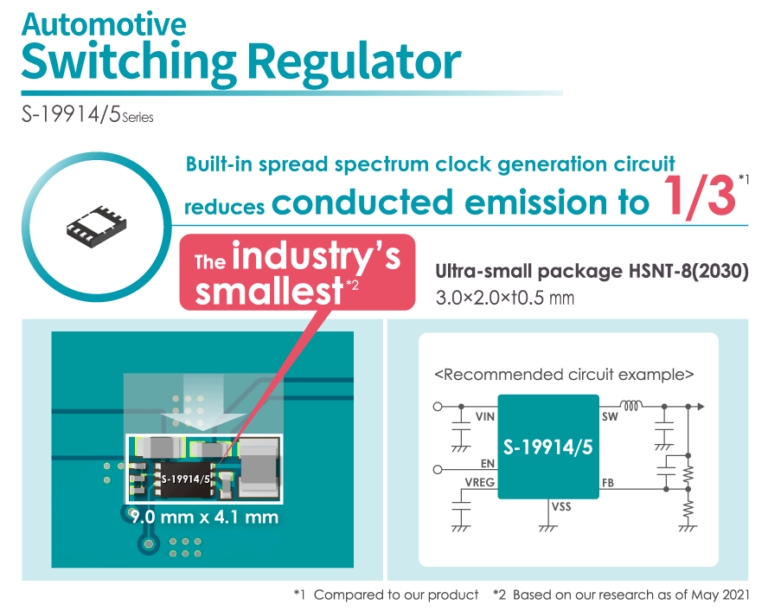 Les S-19914/5 utilisent une fréquence de découpage typique de 2,2MHz, et délivrent des signaux PWM et/ou PFM. Ils acceptent une tension d’entrée comprise entre 4V et 36V pour une sortie régulée entre 2,5V et 12V précise à +/-1,5% avec un rendement maximal de 91%. Ils sont conformes à la norme automobile AEC-Q100 grade 1.