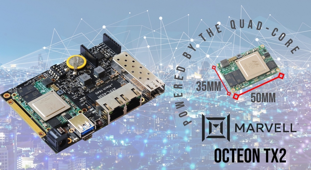 SolidRun a développé un module SoM pour applications réseaux architecturé autour des processeurs Octeon TX2 CN9130 de Marvell Technology. Ces processeurs embarquent quatre coeurs Cortex-A72 cadencés jusqu’à 2GHz (version industrielle) ou 2,2GHz (version commerciale). Figurent également sur la carte un maximum de 8Go de Dram DDR4, 8Go de stockage eMMC et des ports Ethernet jusqu’à 10Gbit/s, USB 2.0/3.0, PCIe Gen3 et SATA.