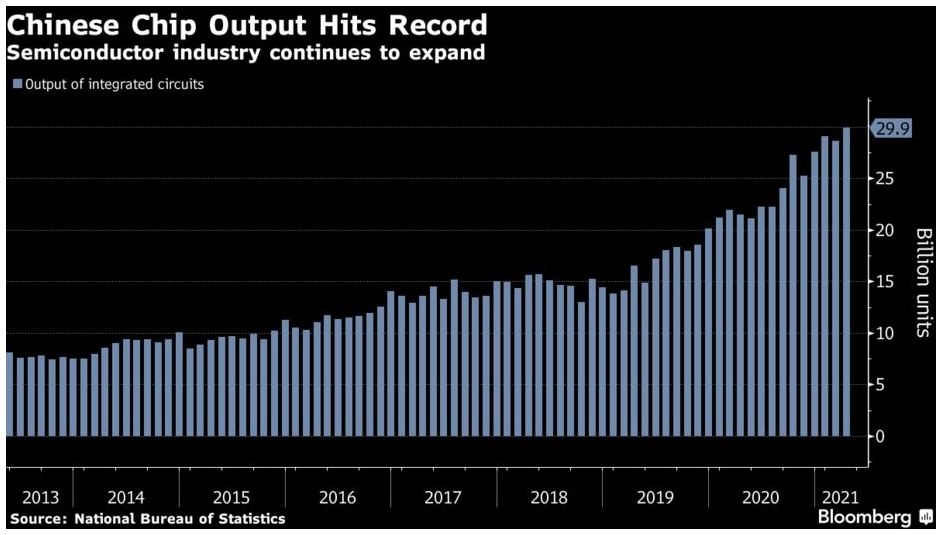 La production de circuits intégrés a augmenté de 38% en Chine au mois de mai par rapport à la même période en 2020.
