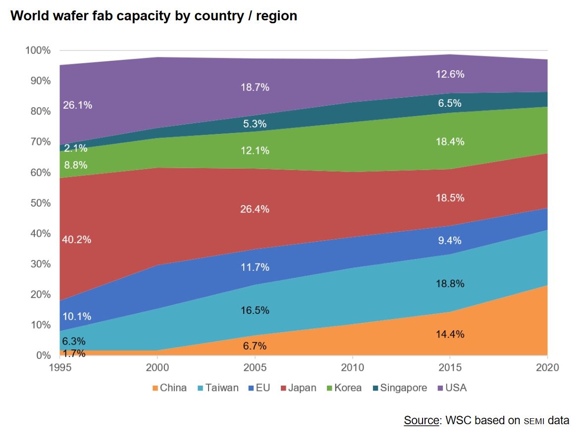 La Chine, qui partait avec une capacité de production mondiale quasi inexistante en 1995 (1,7%), présente la plus forte augmentation avec 14,4% en 2015. De même, Taïwan et la Corée du Sud détiennent respectivement 18,8% et 18,4% des capacités de production de puces en 2015 contre 6,3% et 8,8% en 1995.