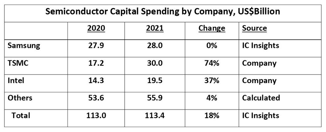 Semiconductor Intelligence rappelle dans son bulletin mensuel que le CapEx du secteur des semi-conducteurs était de 113Md$ en 2020. Cette année, il devrait augmenter entre 16 et 23%.
