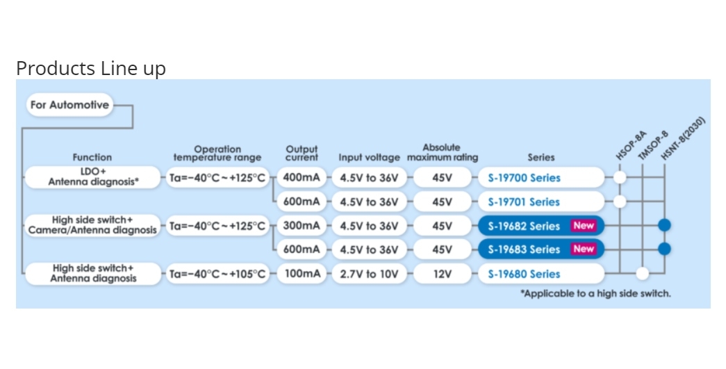Conformes à la norme AEC-Q100 grade 1, les S-19682 et S-19683 supportent une tension d’entrée comprise entre 4,5V et 36V (et même 45V max.), pour un courant de sortie culminant respectivement à 300mA et 600mA.