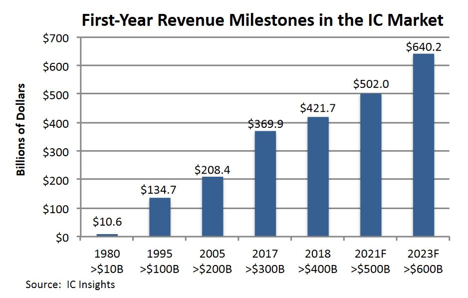 Selon les prévisions du cabinet d’études IC Insights, le marché mondial des circuits intégrés dépassera 600Md$ dans deux ans.
