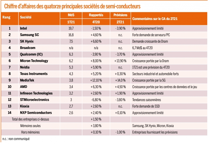 SI LES EXPÉDITIONS MONDIALES DE SEMICONDUCTEURS SE SONT ÉLEVÉES À 123,1 Md$ AU 1ER TRIMESTRE 2021, LES CONTRAINTES D’APPROVISIONNEMENT DEVRAIENT LIMITER LEUR CROISSANCE. C’EST DANS CE CONTEXTE QUE SEMICONDUCTOR INTELLIGENCE A CLASSÉ LES SOCIÉTÉS DE PUCES SELON LEUR CHIFFRE D’AFFAIRES AU 1ER TRIMESTRE 2021.