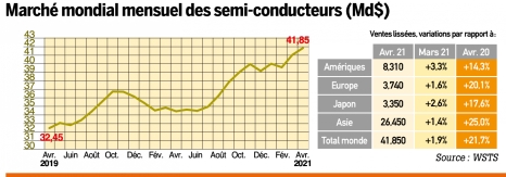 Les ventes mondiales de semi-conducteurs ont atteint 41,85 Md$ en avril 2021, en progression de 21,7 % par rapport à la même période de l’an passé, selon les données du WSTS (World Semiconductor Trade Statistics) et relayées par la SIA. Le marché européen devrait connaître une croissance de 21,1 % cette année.