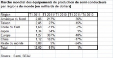Au premier trimestre 2011, les facturations d’équipements de production de semi-conducteurs dans le monde ont progressé de 61 % par rapport au premier trimestre 2010 et de 1 % par rapport au quatrième trimestre 2010, atteignant 12 milliards de dollars, selon l’organisme américain Semi et son homologue japonais, le SEAJ.