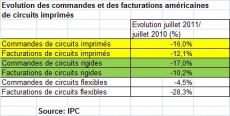 Par familles de produits, les facturations de circuits rigides ont diminué de 10,2 % par rapport à juillet 2010 alors que les commandes de ces composants ont chuté de 17 %.