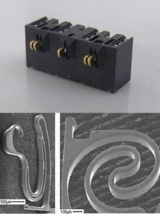 Omron a pour cela utilisé un procédé de fabrication de contacts inédit dans le domaine de la connectique : l’électroformage, qui consiste à créer une fine couche de métal à l’aide d’un procédé d’électrodéposition. Sur le papier, l’électroformage appliqué à la fabrication des contacts de connecteurs évite les principaux écueils du procédé classique qui utilise des presses de précision pour découper et mettre en forme les contacts. L’électroformage permet notamment de réaliser des contacts extrêmement fins – seulement 80 µm de large – ce qui ouvre la voie à des connecteurs FFC/FPC au pas de 0,2 mm, voire 0,1 mm, alors que le procédé conventionnel ne descend pas en dessous de 0,3 mm.
