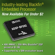 Moins de 2 $ pour un processeur de signal numérique 400 MMAC ! Analog Devices vient de lancer une version cadencée à 200 MHz de son DSP Blackfin ADSP-BF592, commercialisée à seulement 1,99 $ pièce par quantités de 1000.