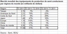 Au deuxième trimestre 2011, les facturations d’équipements de production de semi-conducteurs dans le monde ont progressé de 31 % par rapport au deuxième trimestre 2010 et ont reculé de 1 % par rapport au premier trimestre 2011, atteignant 11,92 milliards de dollars, selon l’organisme américain Semi et son homologue japonais, le SEAJ.