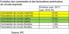 Par familles de produits, en septembre dernier, les facturations de circuits rigides ont baissé de 13,1% par rapport à septembre 2010, et les commandes ont chuté de 19,9%.