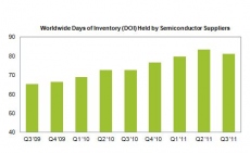 La société d’études américaine IHS iSuppli annonce qu’au troisième trimestre 2011, les stocks mondiaux de semi-conducteurs chez les fabricants de composants ont reculé de 2,5 % par rapport au deuxième trimestre, à 81 jours.