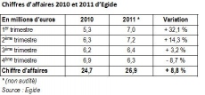 L’analyse par régions montre qu’Egide France a compté pour 66 % du chiffre d’affaires 2011 contre 25 % pour Egide Etats-Unis et 8 % pour Egide Royaume-Uni.