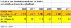 L’an passé, les livraisons mondiales de tranches de silicium (wafers) destinées à la fabrication de semi-conducteurs ont reculé de 3 % par rapport à 2010, à 5,834 millions de mètres carrés, selon l’association Semi.