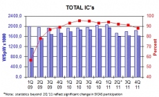 Globalement, au quatrième trimestre 2011, la production réelle de semi-conducteurs (circuits intégrés et discrets) a représenté 1,758 million de tranches par semaine (en équivalent 200 mm de diamètre), pour une capacité installée de 2,038 millions de tranches par semaine, en légère augmentation depuis deux trimestres consécutifs.