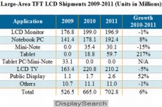 C’est d’ailleurs la première fois en 10 ans – c’est-à-dire depuis le début de la commercialisation des TV LCD -, que les livraisons de LCD de téléviseurs ont baissé d’une année sur l’autre. En surface d’écrans totale livrée, ce marché a cependant progressé de 3 %, la taille moyenne des écrans TV étant supérieure en 2011 à ce qu’elle était l’année précédente.