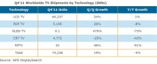 Au 4ème trimestre 2011, les livraisons de téléviseurs ont globalement baissé de 4 % sur un an, à 74,2 millions d’unités. Dans le détail, les livraisons de TV LCD n’ont augmenté que 1 % sur la période considérée alors que, dans le même temps, toutes les autres technologies ont connu de fortes chutes sur un an (cliquer sur le tableau pour l’agrandir). Sur les trois derniers mois de l’année dernière, la part des téléviseurs LCD a atteint une valeur record de 86,5 % (part de marché en volume), très loin devant les TV à écran plasma (7 %), les CRT TV (6,4 %), les miettes restantes allant aux TV à rétroprojection (RPTV) et aux TV Oled.