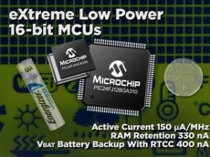 Série PIC24F GA3 de Microchip Ces microcontrôleurs 16 bits ne consomment que 150 μA/MHz en mode actif.