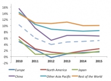 Sur la période 2010-2015, la croissance annuelle moyenne de la production électronique ne devrait être que de 1 % au Japon et en Europe, et de 1,8 % aux Etats-Unis. Les pays d’Asie (hors Japon) devraient concentrer plus de la moitié de la production électronique d’ici 2015.
