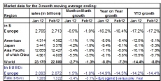 En Europe, plusieurs des grandes catégories de produits ont bien progressé en février malgré un déclin global de 1,9 % à 2,71 milliards de dollars par rapport à janvier. La baisse, calculée en euros, n’est que de 1 %.