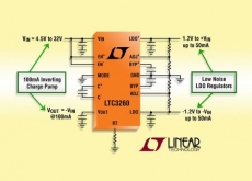 De l’autre, le LTC3260 intègre en sus deux régulateurs LDO (positif et négatif) fournissant chacun jusqu’à 50 mA. Le post-régulateur négatif est ici alimenté au travers de la pompe de charge inverseuse.