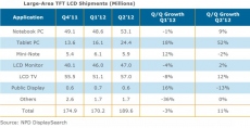 Selon l’analyste, au 2è trimestre, les livraisons de LCD-TFT grands formats dédiés aux moniteurs informatiques, aux PC portables et aux téléviseurs devraient croître de 2 %, 9 % et 12 % respectivement par rapport au 1er trimestre 2012, alors que l’orientation était clairement à la baisse sur les trois premiers mois de l’année, période traditionnellement faible dans cette industrie (cliquer sur le tableau ci-dessus pour l’agrandir). Mais la palme de la croissance est attribuée aux afficheurs de tablettes numériques avec une croissance séquentielle estimée à 52 % au 2ème trimestre. Au 1er trimestre, ce créneau avait déjà bondi de 18 %.