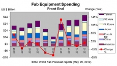 La révision de mai 2012 de l’étude Semi sur les investissements mondiaux en équipements de production de semi-conducteurs fait état, pour cette année, d’une progression de 2 % de ces investissements par rapport à 2011, à 39,5 milliards de dollars (voir graphe). Ces chiffres sont supérieurs à la prévision de février (0 % à 38,8 Md$).