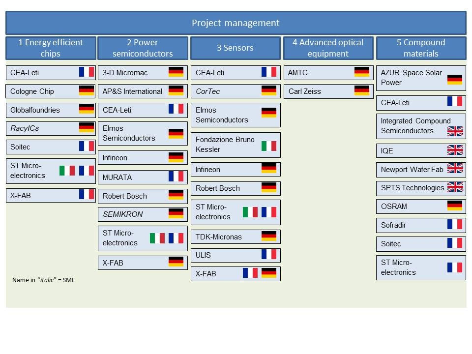Les cinq domaines technologiques sont complémentaires et interconnectés – les puces font souvent partie d’un système intégré. Ces systèmes requièrent une combinaison de processus et de technologies couverts par les différents domaines du projet. Pour cette raison, les participants au projet prendront part à plus de 100 collaborations dans les différents domaines couverts par les 40 sous-projets étroitement interconnectés.