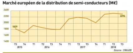 > En Europe, au troisième trimestre 2018, les ventes de semi-conducteurs industriels (hors composants pour PC) par la distribution ont progressé de 6,3 % par rapport au troisième trimestre 2017, à 2,3 milliards d’euros, selon DMASS. À noter : de nouveau, une forte progression pour les pays de l’Est (+ 15,5 %), ainsi que de
