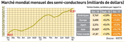 > Sur les 10 premiers mois de l’année 2018, la progression du marché mondial des semi-conducteurs dépasse 17 %, ce qui laisse présager une forte croissance pour l’année entière, même si les taux de progression commencent un peu à faiblir depuis plusieurs mois. 2019 devrait être moins dynamique, les analystes prévoyant pour l’an prochain une