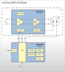 L’américain rend possible la conception d’un module QSFP+ complet consommant moins de 3,5 W. Maxim lance un jeu de circuits d’émission QSFP+ 4×10 Gbit/s combinant une faible consommation et un encombrement une fois et demi supérieur à celui d’une solution 10 Gbit/s. Ce jeu de circuits comprend le driver laser MAX3948 et le contrôleur optique DS4830. Cette solution QSFP+ consomme moins de 2 W pour les 4 canaux, soit moins de 3,5 W pour un module QSFP+ complet.