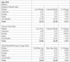 Plus précisément, les ventes de semi-conducteurs en juillet 2012 ont augmenté de 4,2 % au Japon par rapport à juillet 2011, de 1,4 % en Asie-Pacifique, mais ont été significativement plus faibles en Europe (-10 %) et en Amérique (-10,4 %). Sur une base séquentielle (d’un mois par rapport au précédent), les ventes ont augmenté au Japon (+5,4 %) et en Asie-Pacifique (+0,3 %), elles sont restées stables en Europe et ont diminué en Amérique (-3,9 %). Le Japon a enregistré sa plus forte croissance séquentielle depuis septembre 2009 et sa plus importante augmentation sur 12 mois depuis janvier 2011.
